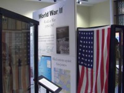 WORLD WAR II – The epic struggle of “The Great War” is represented in our museum with exhibits honoring our soldiers, sailors, airmen and Marines. The 1942 Army infantry sergeant is prepared for the North African campaign in all-original clothing and equipment. The 1942 Marine staff sergeant is prepared for battles in the island jungles of the South Pacific. The 1944 Army Air Force aviator represents a Tuskegee aviator in Italy. Our Navy display case features an assortment of original artifacts from ships during the war and an original Navy uniform, with artifacts also from the Merchant Marine and the Coast Guard.